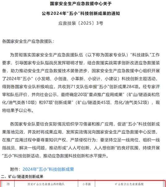近日,由国家安全生产应急救援中心组织开展的 2024 年“五小”科技创新成果评选活动圆满收官。在此次评选中,山西省煤炭地质一一五勘查院有限公司相关科研人员作为主要发明人研发的《矿山数字应急救援系统》,代表国家矿山应急救援山西特勘队,从 284 项参评项目中脱颖而出,成功斩获创新成果奖。